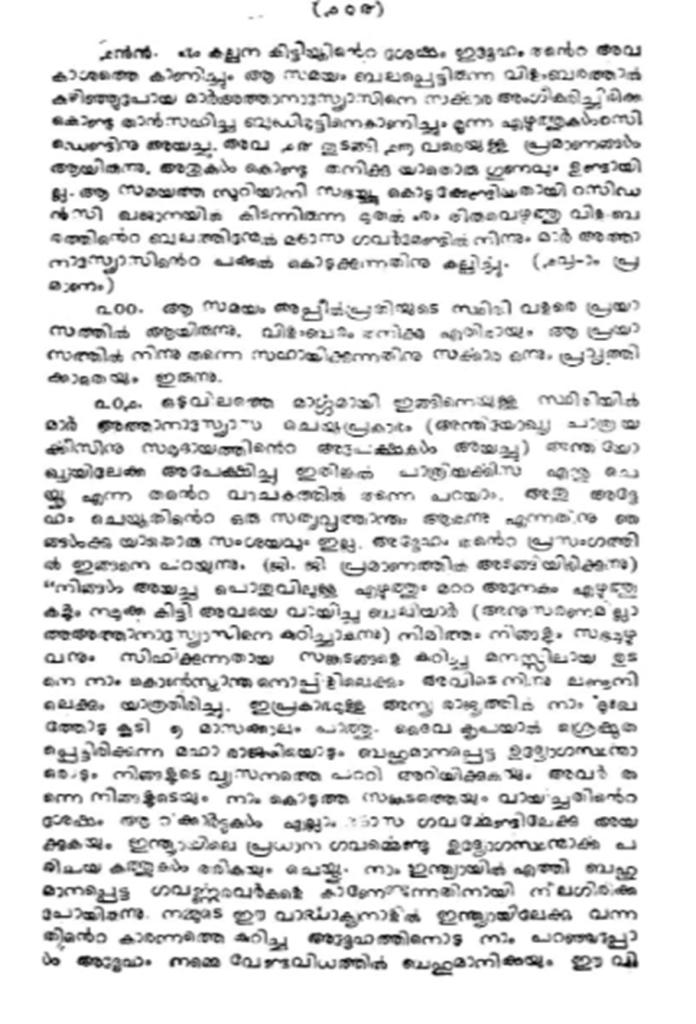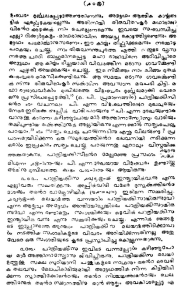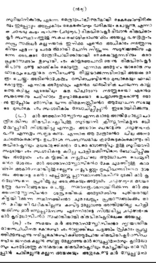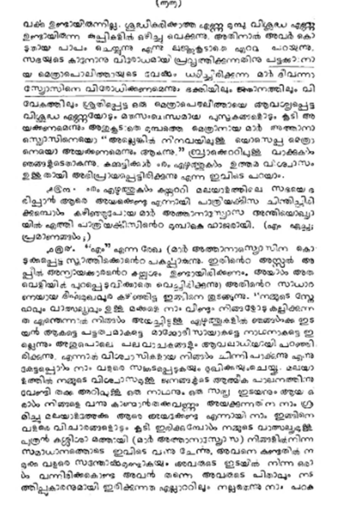 That whereas an interview held at Kottayam between the Rt.Rev. Daniel, Lord Bishop of Calcutta and the Metropolitan, in Vrischikam last, it was proposed by the former that certain changes should be introduced in the Liturgies and ordinances of our Syrian Church and whereas it was stated in reply that a conference of all the churches would be held on the subject and its determination made known, we the Jacobite Syrians being subject to the supremacy of the Patriarch of Antioch and observing as we do the Liturgies and ordinance instituted by the prelates sent under his command, cannot deviate from such Liturgies and ordinances and maintain a discipline contrary thereto, and a man of one persuasion being not authorized to preach and admonish in the church of another following a different persuasionwithout the permission of the respective Patriarachs, we cannot permit the same to be done against us, and our churches being built by the aid of the pre-lates sent under the order of the Patriarch and on the wishes of the people of each parish and ornamented by their money, and as the accounts of the annual income according to our churches under the head of voluntary contributions offerings etc, are as required by the rules furnished to our bishops, as is the custom in the churches of Antioch as well as in the churches of this and other countries following different persuasions we are without the power, and feel disinclined, to follow and cause to be followed a different procedure from the above. That the Honourable Colonel Macaulay having taken a loan of 3000 star pagodas from (Valia) great Mar Dionysius who died in 983, gave him a bond for the same. The interest on the amount having fallen in arrears, Mar Dionysius Metropolitan who died in 992 made a representation to Col. Munro and received the interest with which he (Dionysius) built the Seminary at Kottayam. Having also collected at the Seminary the money brought by the prelates that had come here from Antioch and the property left by the late Bishops of the Pakalomattom family, Mar Dionysius laid out a portion of this together with the donation made by HIS HIGHNESS THE MAHARAJA on behalf of the Syrian Christian Youths, on Kanom and therewith met the expense of their education. The Reverend the missionaries who have come down to Kottayam, in their profuse benevolence taught the youth at the Seminary, English and other languages, protected our children like loving fathers, caused books to be printed for the benefit of all classes, rendered all necessary help in maintaining the prevailing discipline of the Syrian Church caused the annual interest due, to be drawn on the receipt of the Metropolitan, had superintendence over the affairs of the Seminary and caused ordination to be made agreeable to the request of the people and the power of the prelates. While affairs were being thus conducted the Missionaries took to managing the Seminary without consulting the Metropolitan, themselves expended the interest money drawn annually on the receipt of the Metropolitan, dispersed the deacons instructed in the Seminary, conduct deacons instructed in the Seminary, conducted affairs in opposition to the discipline of the church and created dissensions amongst us, all of which have occasioned much sorrow and vexation. For this reason we do (would) not follow any faith or teaching other than the Orthodox faith of the Jacobite Syrian Christians, to the end, that we may obtain salvation through the prayers of ever happy, holy, and ever-blessed Mother of God, the redresser of all complaints and through the prayers of all Saints. Witness, Father, Son and Holy Ghost. Amen