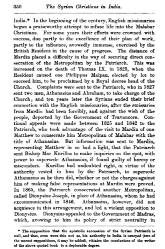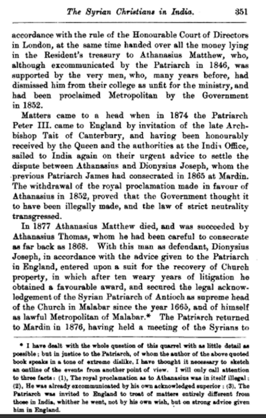 he had fulfilled his office faithfully, seeking by the grace of God to revive the slumbering church of his people, and always grateful for the friendly counsel of the Anglican missionaries ; and under his benign rule the Syrian Christians had increased in prosperity, trebled the number of their churches, and greatly improved in moral character. But many of the priests resented his efforts for reform, and complained to the Patriarch of Antioch, who sent two or three other bishops, not natives of India, and therefore regarded as foreign intruders, to supplant him. The better disposed of the clergy, however, stood by him, and he consecrated his cousin, Mar Thomas Athanasius, to be his coadjutor — as had been the custom in the Church in former times. The inevitable result was the division of the Church into two antagonistic parties ; and the spirit of the reactionary bishops was shown by one of them throwing down a Malayalam Bible which he found in one of the churches and trampling on it.(overegging it !! SK. 12.2.2025. ) In 1874 the Jacobite Patriarch visited England with a view to getting the British Government to interfere in the quarrel and turn Mar Athanasius out of the churches and other properties held by the reforming party. He was received by many advanced English Churchmen, who knew nothing of the case, with effusive reverence; but Mr. Whitehouse, who had long been chaplain at Cochin, and knew more of the circumstances than any other living man, exposed his pretensions in the pages of the CM, Intelligencer, showing that the Malabar Church had originally no connexion with the Jacobites of Antioch, and that although Antioch had done it a good turn by restoring to it the episcopal succession in the seventeenth century, it had always had Native bishops and was in fact an independent Church. Eventually the Patriarch was advised by Archbishop Tait to leave it to manage its own affairs ; but meanwhile he had appointed a new Native Metran, around whom the reactionary party had rallied, and the division and dissension continued — and has continued to the present time.*